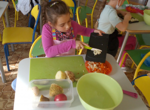 W nawiązaniu do lekcji o warzywach i zdrowym odżywianiu, zrobiliśmy sałatkę jarzynową. Każdy przyniósł niezbędne produkty i przybory. Podczas krojenia marchewek, ziemniaków, ogórków i innych warzyw zachowaliśmy podstawowe zasady higieny i bezpieczeństwa. Ubrani w kolorowe fartuszki samodzielnie...